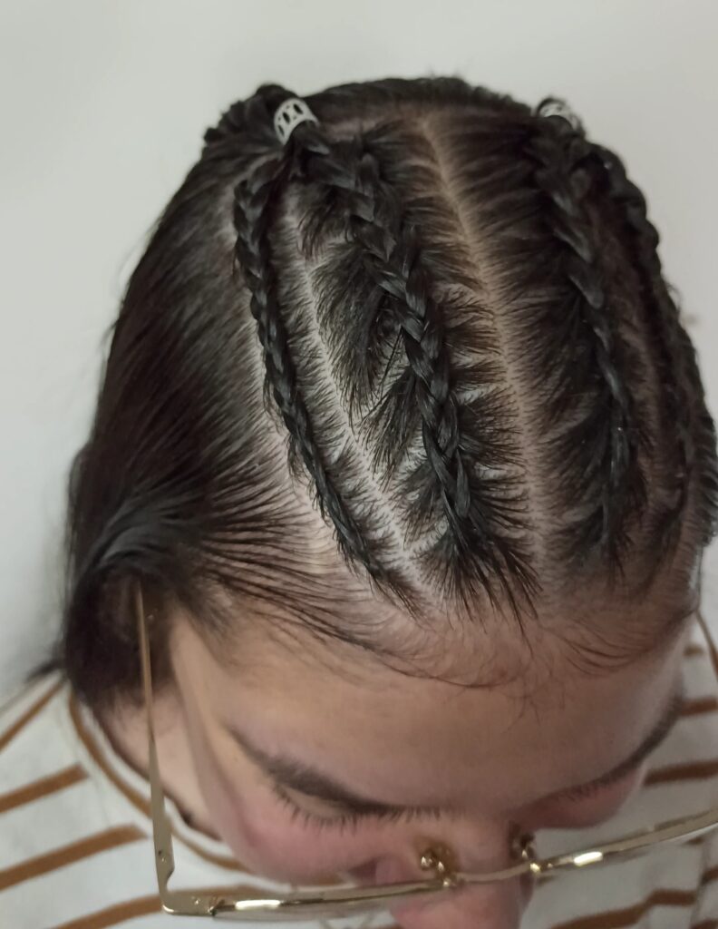 • Cornrows (Trenzas pegadas): Diseños artísticos y precisos que realzan tu rostro.